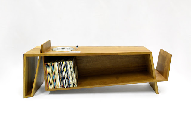 The Folded Record Bureau, by Hugh Miller, combines in one classic and original creation three of the designer's favorite things: wood, vinyl records and 80's styling.